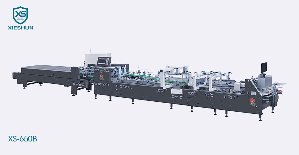 XIESHUN leverantör XS-650B Crash Lock Automatisk höghastighetslimmaskin Lämplig för liten storlek av krocklåslåda och rak linjelåda i hög hastighet och effektiv produktion, tillämpas i läkemedels- eller kosmetiska industrier. Kartong 200-800 gsm och korrugerad lådflöjt N/E och flöjt F.