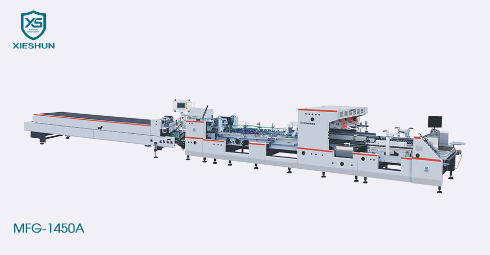 XIESHUN MFG-1450A Kraftig mapp- och limmaskin med rak linje, lämplig för raklinjevikbara kartonger. Med PLC, växelriktare och kraftfull motorstyrning, viksektion med servomotorstyrning som säkerställer att den går stabilt och fungerar bekvämt.